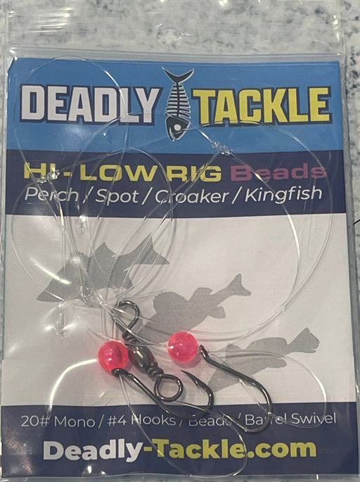 Deadly TackleOriginal price $3.50 - Original price $3.50Original price$3.50$3.50 - $3.50Current price $3.50| /In stockDeadly Tackle Hi-Lo rig for perch, spot, croaker, kingfish and more! 20# Mono – Size 4 Hooks – Beads